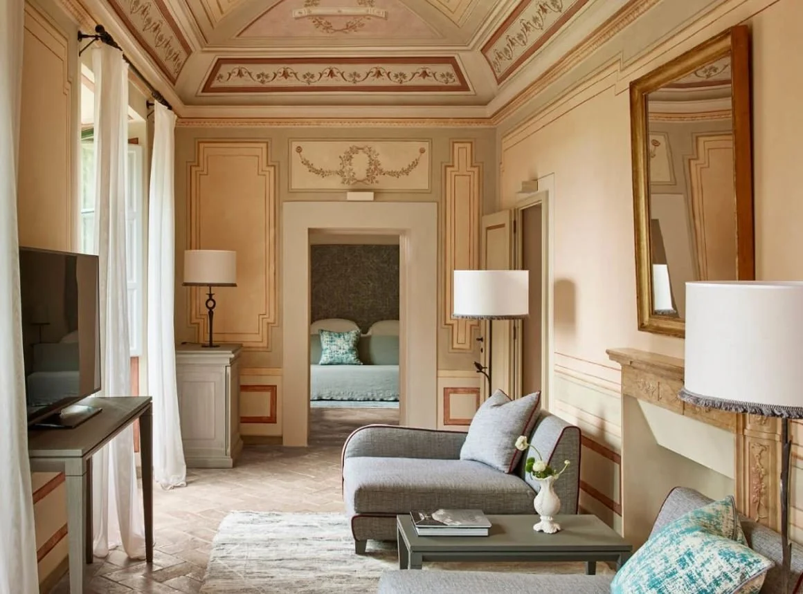 Signature Suite: The Royal Suite (1,184 sq ft) stuns with original 18th-century frescoes, a grand four-poster bed, and views over the Palazzo della Gherardesca gardens. It’s a Florentine fairytale unlike anything you’ve ever seen.