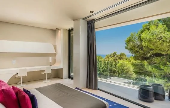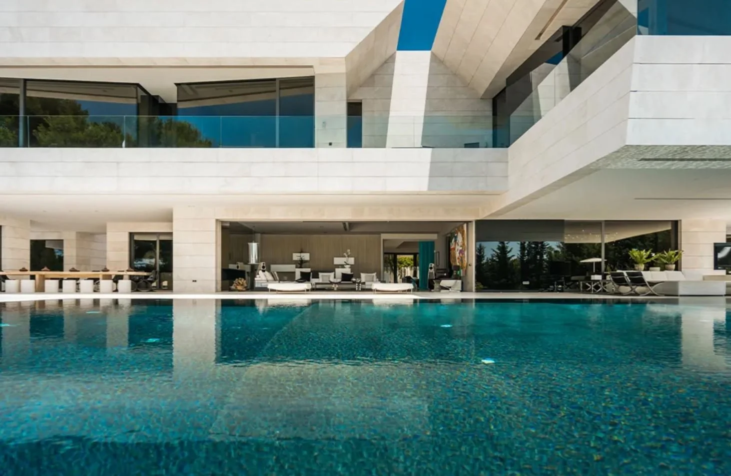 Villa El Nido is a contemporary architectural house set amid lush greenery, offering complete privacy while staying just minutes from Marbella's vibrant scene. The design emphasizes open spaces and natural light, with fully retractable glass doors that connect the expansive terrace to the main lounge, creating effortless flow between indoors and out. Interiors are chic and inviting: plush sofas, a grand piano in the spacious dining room (seating 16), a glass wine cellar, a smaller lounge with modern sculpture, a dedicated TV room, two studies, and a sleek Poggenpohl kitchen. Outdoor highlights include a massive 23-meter infinity pool with sea views, sun loungers, shaded day beds, open-air and covered lounge areas, an al fresco dining setup with BBQ facilities, and grassy lawns on two levels ideal for relaxation or play. A floodlit tennis court tucked in the forest adds a sporty touch, while balconies on the upper floor offer even more breathtaking vistas. The villa's 3,152 sqm of living space feels like a sophisticated family home, comfortable and elegant.