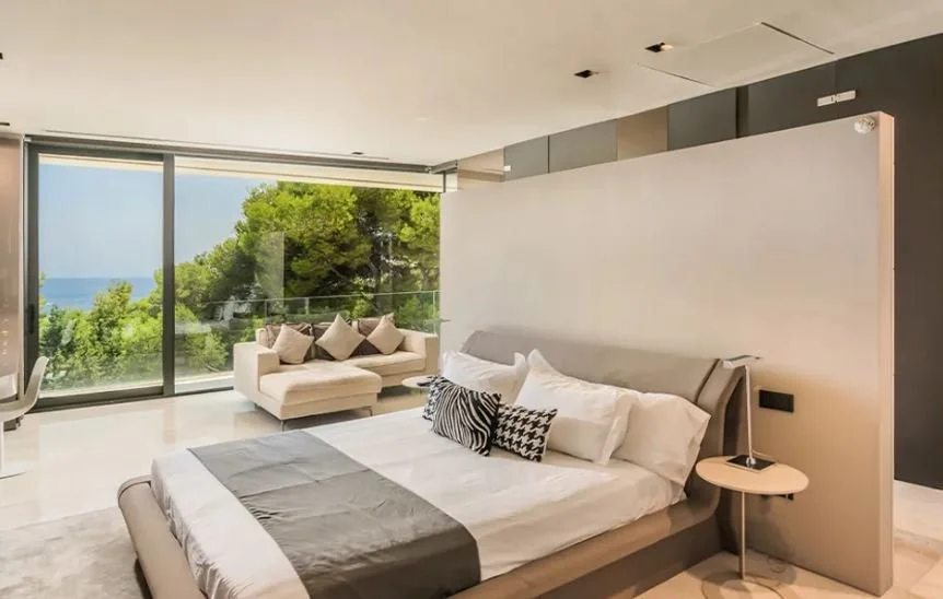 Main Villa (6 bedrooms): All feature queen-size beds (Bedrooms 2–6) or a king-size bed (Bedroom 1), luxurious en-suite bathrooms, and private terrace access. Front-facing rooms and balconies provide panoramic sea views.